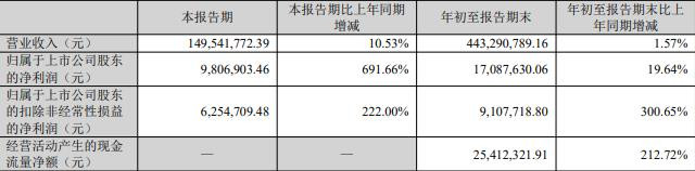 年初至报告期末,公司实现营业收入4.43亿元,同比增长1.57%;归属于上市公司股东的净利润1708.76万元,同比增长19.64%;扣除非经常性损益后的净利润910.77万元,同比增长300.65%;经营活动产生的现金流量净额2541.23万元,同比增长212.72%。