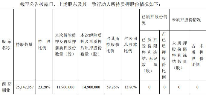 公示7月19日披露关于控股股东所持股份解除质押及再质押的公告,近日接到公司控股股东西部铟业的通知,获悉其将持有公司股份进行了解质押及再质押的手续。截至公告披露日,西部铟业本次解除质押及再质押后质押股份数量14,900,000股,占其所持股份比例59.26%,占公司总股本比例13.80%。
