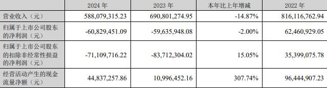 据公司2024年年报,报告期内,公司实现营业收入5.88亿元,同比减少14.87%;归属于上市公司股东的净利润-6082.95万元,2023年为-5963.59万元;归属于上市公司股东的扣非净利润为-7110.97万元,2023年为-8371.23万元;经营活动产生的现金流量净额为4483.73万元,同比增长307.74%。